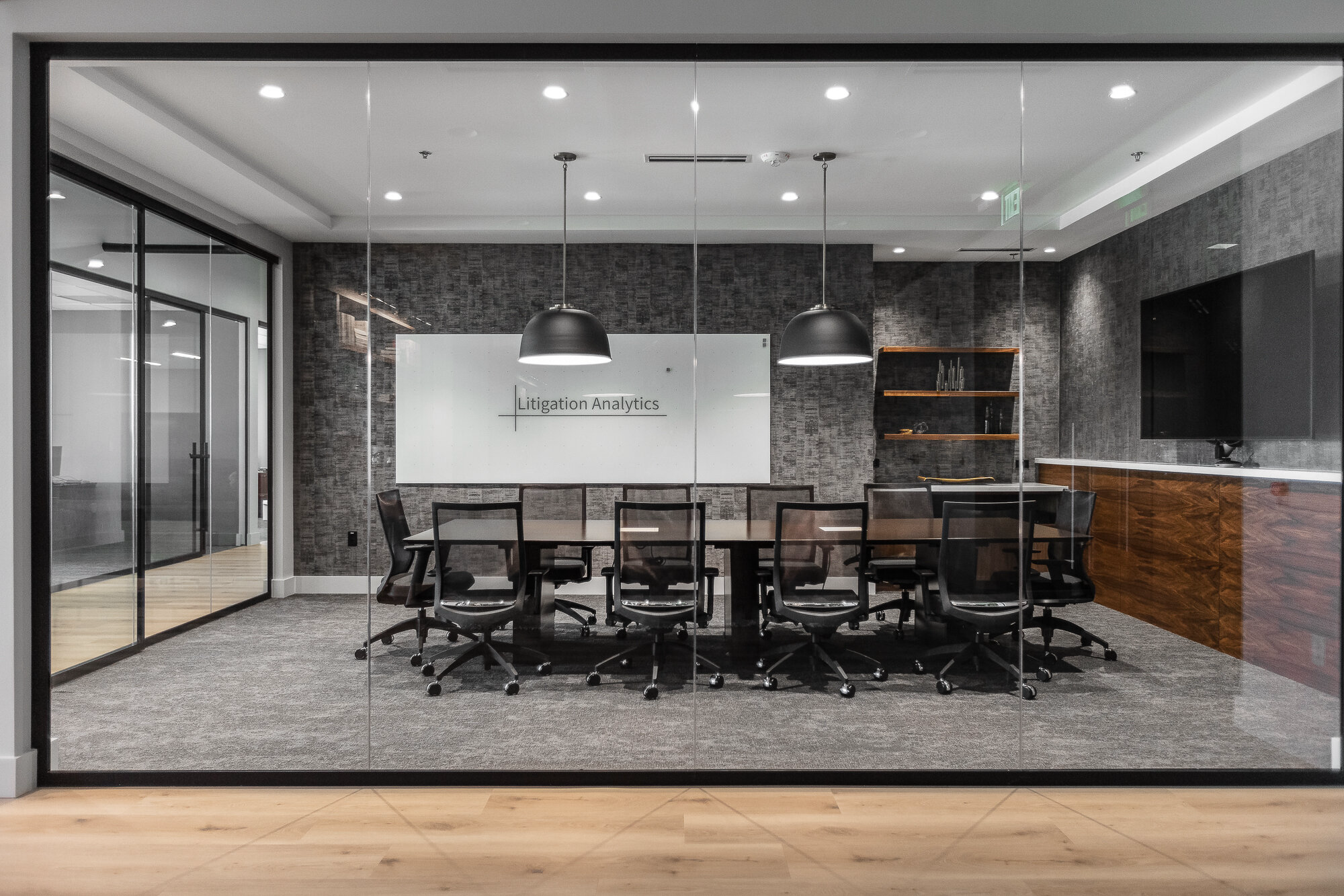 Litigation Analytics wanted a functional, modern, clean line office design that maximized daylighting and privacy for their staff and clients. BRNS worked with the team to provide multiple meeting zones with varying technology and privacy requirements and custom workstation solutions to allow the company to have the space to meet the demands of their day-to-day workflow. BRNS worked with the company’s current artwork and furniture to create a flexible and fun environment matching the spirit of the company. Our design team finished the project by directing the installation of all furniture and equipment and organizing the space so that it felt like home from the very beginning.
