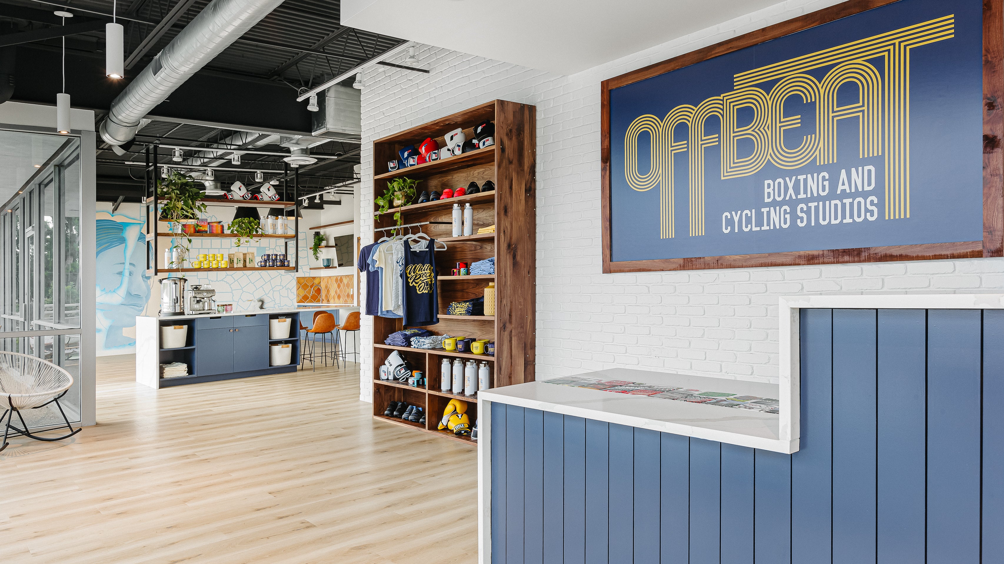 Offbeat Boxing and Cycling Studio approached BRNS to develop a design to fit their vision of an industrial modern, fun, and functional boxing and spin studio. They wanted a flexible space that could accommodate people who come and go along with members that want to stay, eat, and meet for a while. We worked with the team to develop a design that represented Offbeat and the surrounding community, designing several unique custom pieces with the owner to make working out a very communal experience.