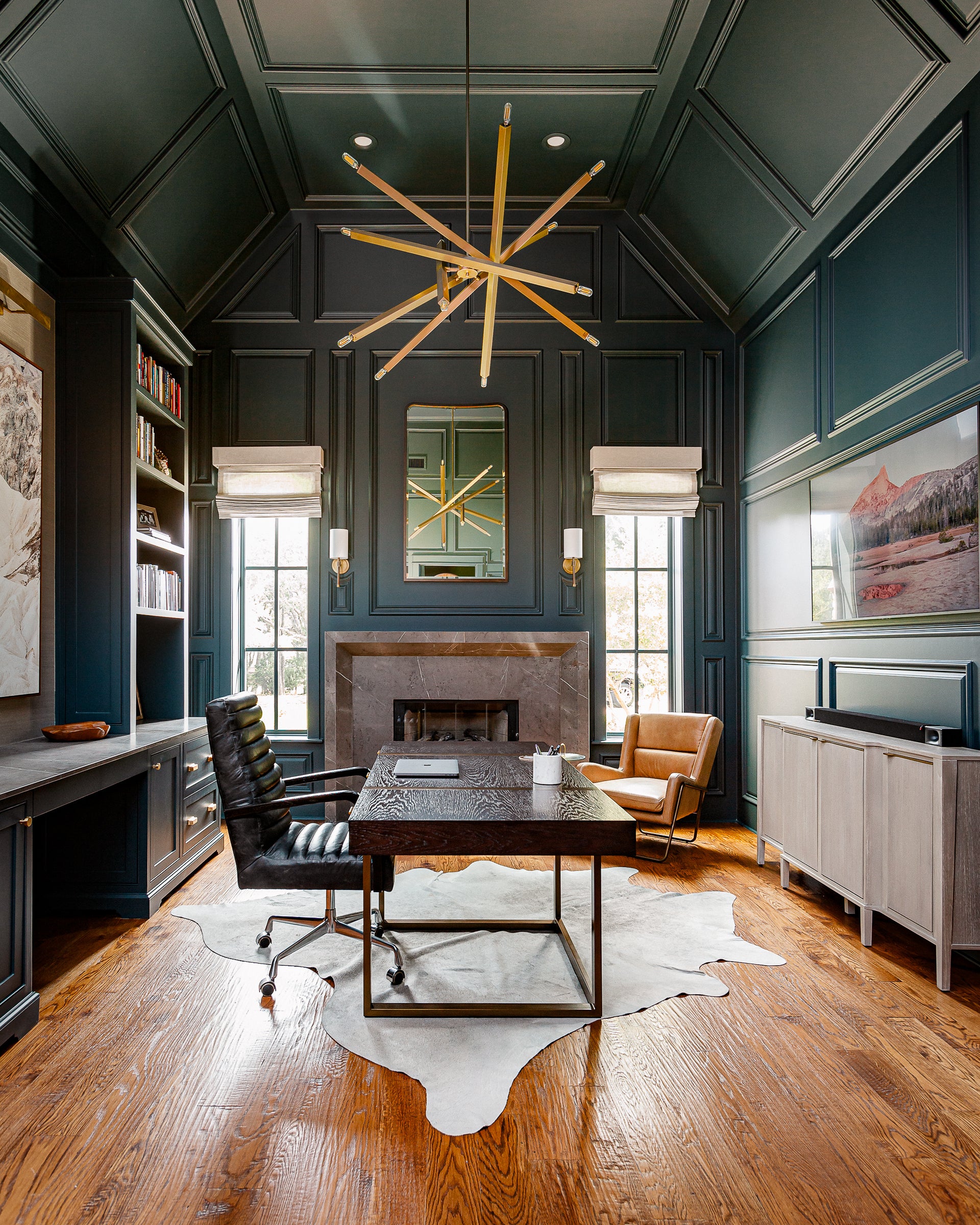 This Keller office remodel blends masculine elegance with transitional style, featuring a stunning fireplace as the focal point. Detailed paneling, grasscloth wallpaper, and carefully selected furniture created a sophisticated yet functional environment.